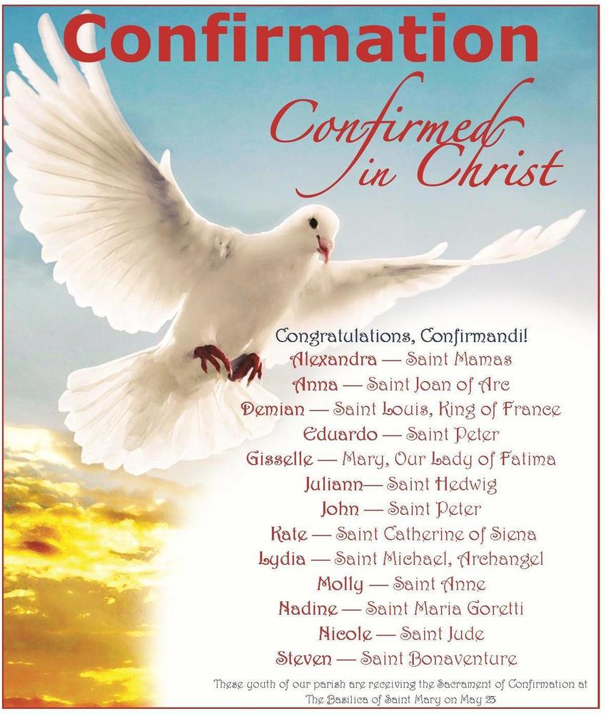 13 Youth of our parish have spent many months studying, praying and discerning God's call in their lives. Please pray for them as they prepare to receive the Sacrament of Confirmation on May 23. They have each chosen a Confirmation saint, so please also ask these saints for their intercession in our prayers.